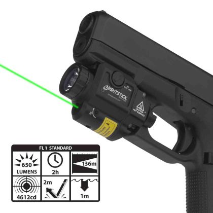 Nightstick TCM-10-GL je kompaktní taktická svítilna se zeleným laserem, určená pro širokou škálu pistolí vybavených montážní lištou. Mimořádně jasná LED dioda o výkonu 650 lumenů využívá precizní čočku s úplným vnitřním odrazem (TIR), která vytváří koncentrovaný bílý paprsek s dosvitem 136 metrů.