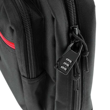 První dvě kapsy se dají uzavřít pomocí dvoucestného zipu a pojistit pomocí přibaleného zámku na číselný kód.