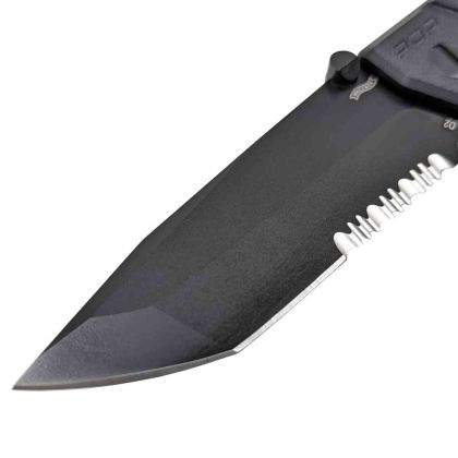 Srdcem nože je potahovaná čepel Tanto se zoubkováním z extrémně odolného materiálu D2.